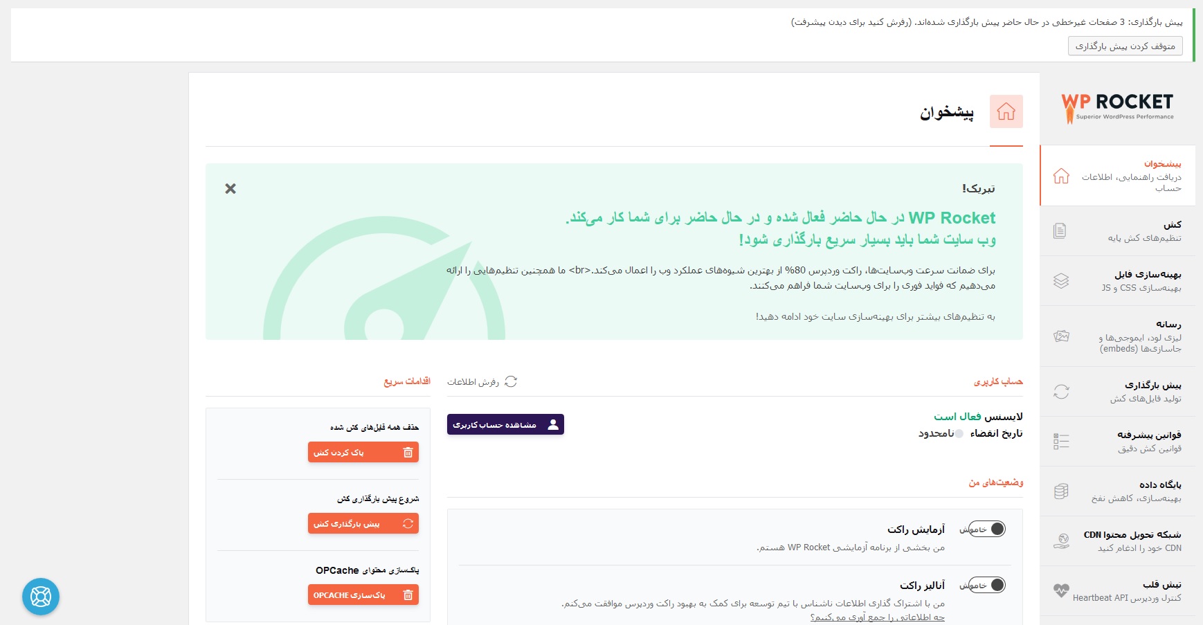 • زمانی که روی  لینک “پیش بارگذاری کش” در منوی مدیریت وردپرس و یا داشبورد موشک وردپرس کلیک می‌کنید.