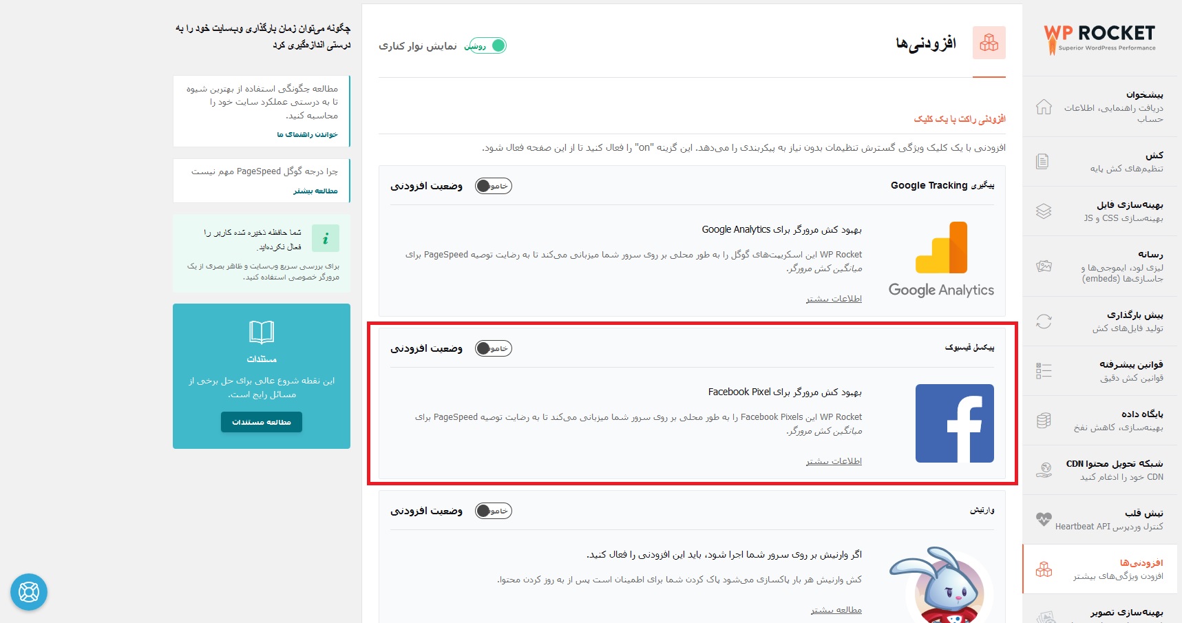 بعد از افزودنی (Add-on) ردیابی گوگل (Google Tracking) در WP Rocket 3.1، یک افزودنی با یک کلیک  برای کش کردن فایل های ردیابی فیس بوک به صورت محلی اضافه شده.