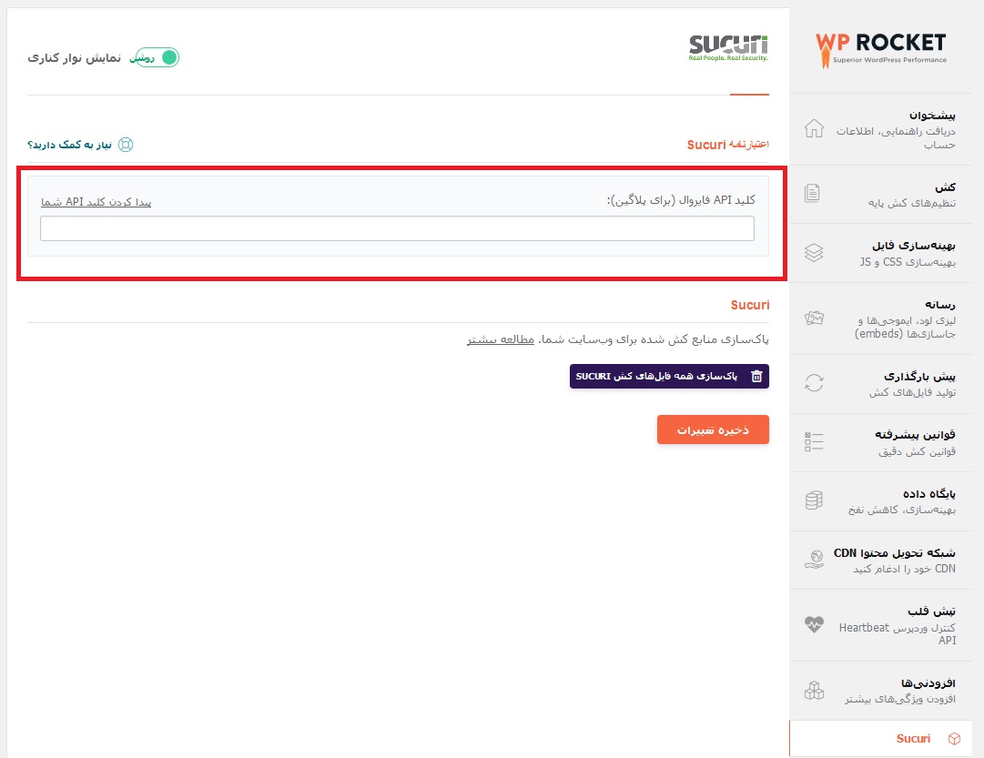 تنها کاری که نیاز هست انجام بدین اینه که کلید API اکانت Sucuri خود را با کمک افزودنی Sucuri پلاگین موشک وردپرس وارد کنید: