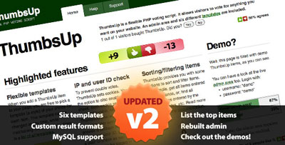 ThumbsUp یک اسکریپت فوق العاده می باشد که با استفاده از آن میتوانید یک سیستم امتیاز دهی راه اندازی کنید. شما با استفاده از این اسکریپت قادر خواهید بود یک سیستم امتیاز دهی (مثبت و منفی) در 7 نوع (پسندیدن – نظر سنجی – مثبت و منفی درصدی و تعدادی – و…) ارائه دهید! همچنین این اسکریپت به صورت ایجکس و یک کنترل پنل مدیریت می باشد.