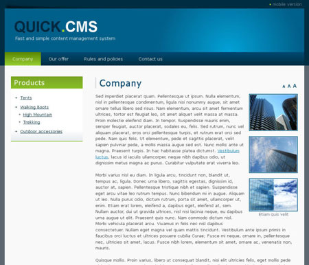 Quick CMS نام یک سیستم مدیریت محتوای متن باز و رایگان می باشد که با استفاده از آن قادر هستید یک وب سایت با امکانات مختلف راه اندازی کنید. شما در این سیستم قادر هستید براحتی اقدام به ایجاد صفحات و مطالب دلخواه کنید. فایل های خود را به اشتراک بگذارید و آن ها را به راحتی مدیریت کنید. به گفته طراحان این سیستم ، امنیت فراوان و استفاده کم از منابع سرور از مشخصات بارز این اسکریپت می باشد. امکانات کلی این سیستم را نام می بریم.