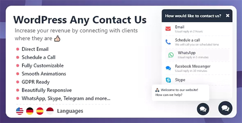 افزونه وردپرس تماس با ما WordPress Any Contact Us از پیام رسان های مختلفی همچون تلگرام ، واتس آپ و اسکایپ پشتیبانی کرده و به شما این امکان را می‌دهد تا از این طریق با مشتریان خود در ارتباط باشید. این افزونه دارای پاپ آپ های هوشمند نیز می باشد که به صورت خودکار پیام های جهت تشویق کاربر برای تماس با شما ارسال خواهد کرد. این افزونه دارای امکانات مختلف دیگر نیز می باشد که می‌توانید از ادامه مطالعه کنید.