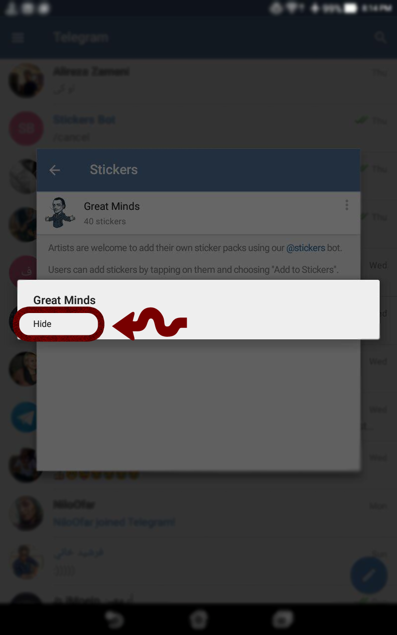 پس از ورود به این مسیر تمامی بسته های استیکر نصب شده بر روی تلگرامتون به شما نمایش داده میشود. با تاچ کردن بر روی ⁞ و انتخاب گزینه hide استیکری را مخفی یا با استفاده از remove حذف کنید.