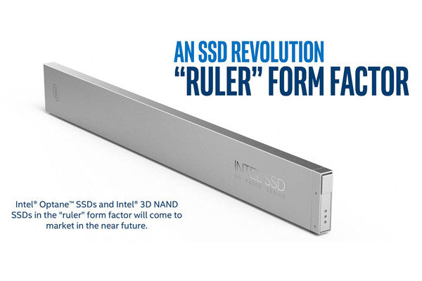این دیسک ها در فرم فکتور کاملاً جدید به نام «خط کش» (Ruler) عرضه می شوند. برخلاف درایوهای مرسوم که در ابعاد 2.5 و 3.5 اینچی عرضه می شوند، یا کارت های ذخیره سازی که با درگاه PCI-e سازگارند، اینتل از فرم فکتور طویل و باریکی استفاده کرده که درون رَک های استاندارد سرور نصب می شوند.