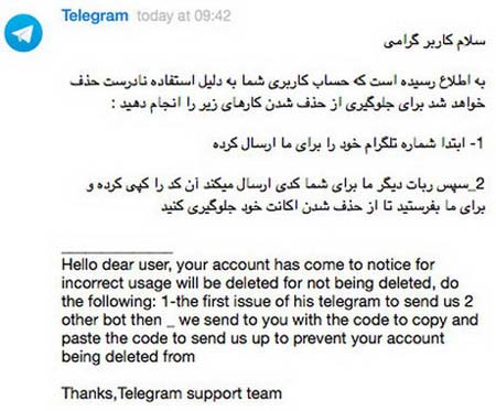 مراحلی که هکر انجام میدهد تا با استفاده از جعل نام و تصویر تلگرام، طعمه را به دام انداخته و داخل حساب کاربری تلگرام فرد شوند به این طریق است که با یک نام جعلی و با تصویر لوگوی تلگرام برای شما پیامی همانند زیر ارسال میشود
