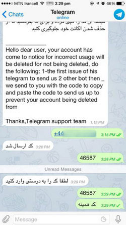 بعد از این مرحله، هکر با وارد کردن شماره تلفن در سایت یا اپلیکلیشن تلگرام، خود را به عنوان کاربری جدید (با شماره شما) به سایت معرفی کرده و کد تأیید از سوی تلگرام، از طریق پیامک یا پیام در داخل اپلیکیشن تلگرام برای شما ارسال میشود.