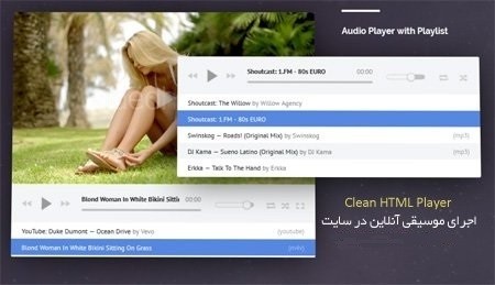 Clean HTML Audio Player نام یک اسکریپت تجاری به صورت HTML و jquery می باشد که با استفاده از آن میتوانید یک Player آنلاین موسیقی راه اندازی کنید. از قابلیت های کلیدی این اجرا کننده موسیقی می توان به امکان ایجاد لیست (Play List) ، پشتیبانی از فرمت های mp3, aac/h.264, ogg, wav, live streaming ، پشتیبانی از موبایل ها و تبلت ها ، قابلیت دانلود موسیقی ها ، تنظیم صدا ، موسیقی قبلی و بعدی ، امکان تنظیم حالت تکرار روی موسیقی اشاره نمود.