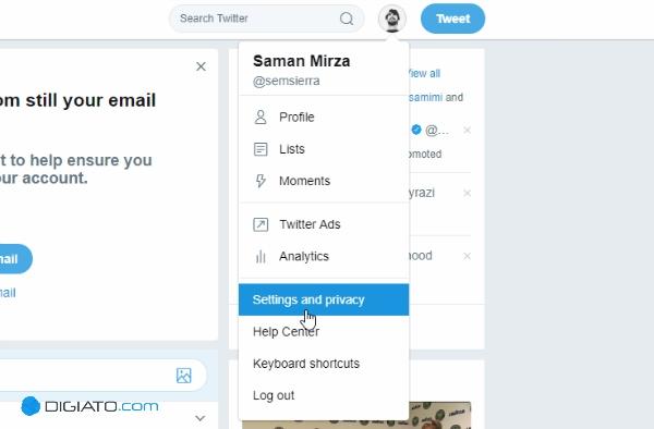 برای انجام این کار وارد وبسایت توییتر شده و با کلیک روی آواتار خود در بالا سمت راست تصویر گزینه Setting and privacy را انتخاب نمایید. پس از آن از منوی سمت چپ روی سربرگ Password ضربه بزنید و سپس اقدام به تغییر دادن رمز عبور کنید.