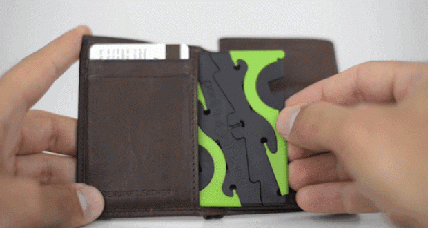 در تصویر متحرک زیر میتوانید حالت جمع شدهی این وسیلهی پلاستیکی را مشاهده کنید که به راحتی و مانند یک کارت اعتباری، داخل یکی از شیارهای کیف قرار میگیرد: