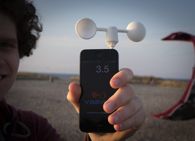 دستگاه بادسنج Vaavud که به شما اجازه می دهد سرعت باد را در هر لحظه و هر جایی با آیفون و یا گوشی اندرویدیتان اندازه بگیرید. همراه این دستگاه ۴۵ دلاری اپلیکیشنمخصوص آن هم ارائه می شود که وظیفه اصلی محاسبه سرعت باد را دارد همچنین با این اپلیکیشن شما قادرید سرعت باد را که برای هرنقطه محاسبه کرده اید به اشتراک بگذارید و از اطلاعات دیگران هم استفاده کنید. در نتیجه با مشاهده سرعت باد در نقاط دیگر می توانید اگر قصد سفر یا برنامه ریزی خاصی داشته اید در آن تجدید نظر نمایید.